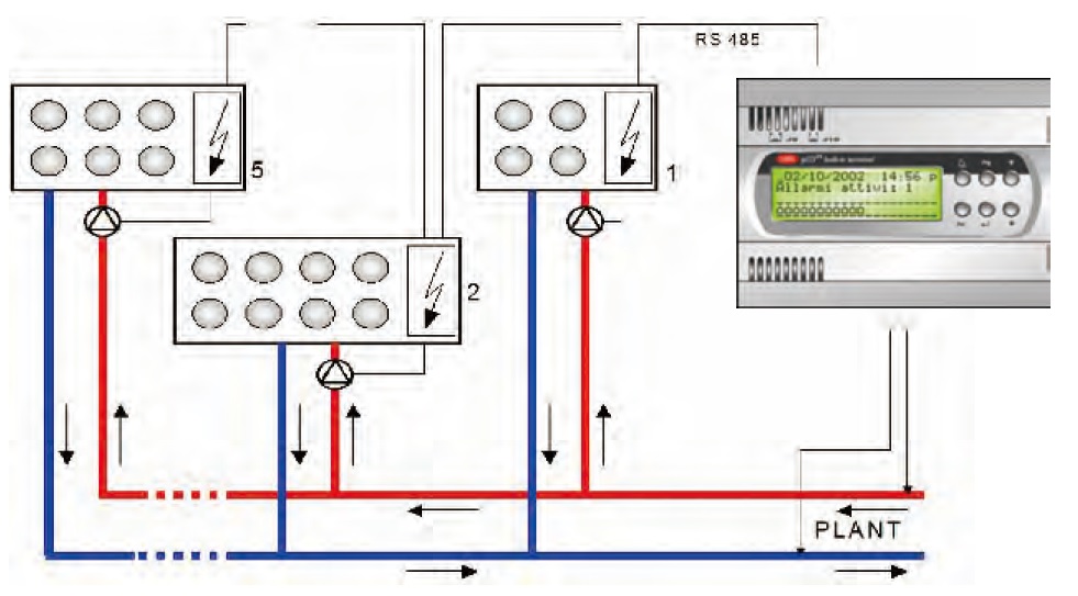 可控制5台Climaveneta空调机组 适用于: 水/风冷冷水机组,水/风冷热泵,带部分热回收功能机组等两管制系统